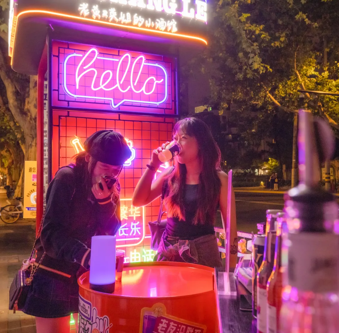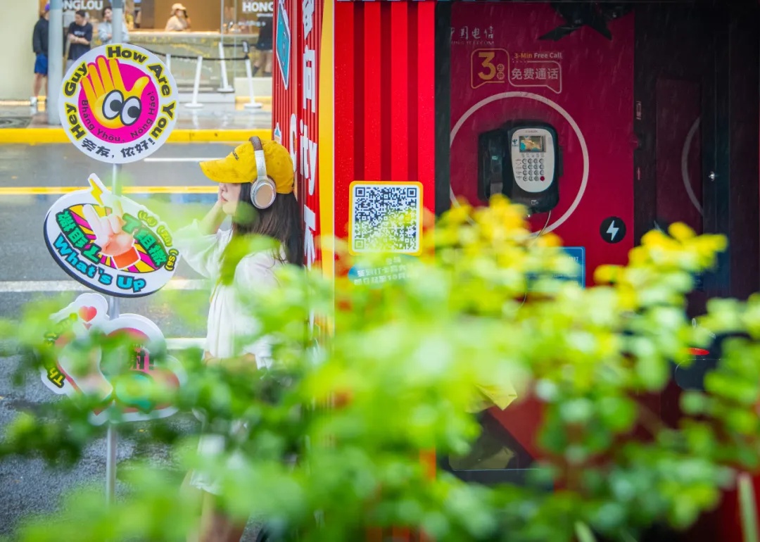 長樂路馬路酒吧“鼻祖”624CHANGLE酒吧新址百米遠處,街邊的數字公話亭“兼職”開起快閃酒吧,不時有年輕人駐足要一杯“老友”系列特調雞尾酒;遊人如織的淮海路上,一向走“實力派”路線的數字公話亭變身超大號現代藝術裝置,火紅的旅行箱造型“顯眼包”,引來不少遊客推着行李箱與之合影。