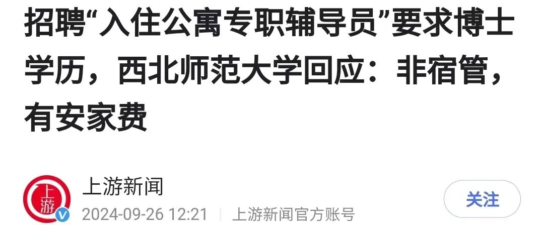 西北師範大學招“入住公寓專職輔導員”,也要求博士學歷。