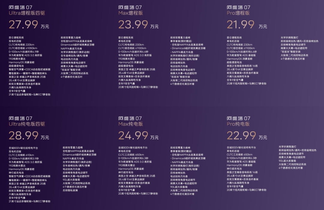 因為這些車的核心賣點很重疊,比如説同樣帶激光雷達的高階智駕車型,問界 M7 最便宜的是 28.98 萬,問界 M5 是 24.98 萬,而阿維塔 07 把這個門檻拉低到了 23.99 萬,它應該是目前市場上最便宜的帶華為高階智駕的車子。