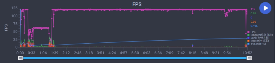 王者榮耀在極高幀率與高分辨率的選項下,除去部分加載的場景,遊戲時基本都能跑 110-120 幀。個別情況下因為發熱,團戰時幀率會有略微的波動,但整體問題不大。