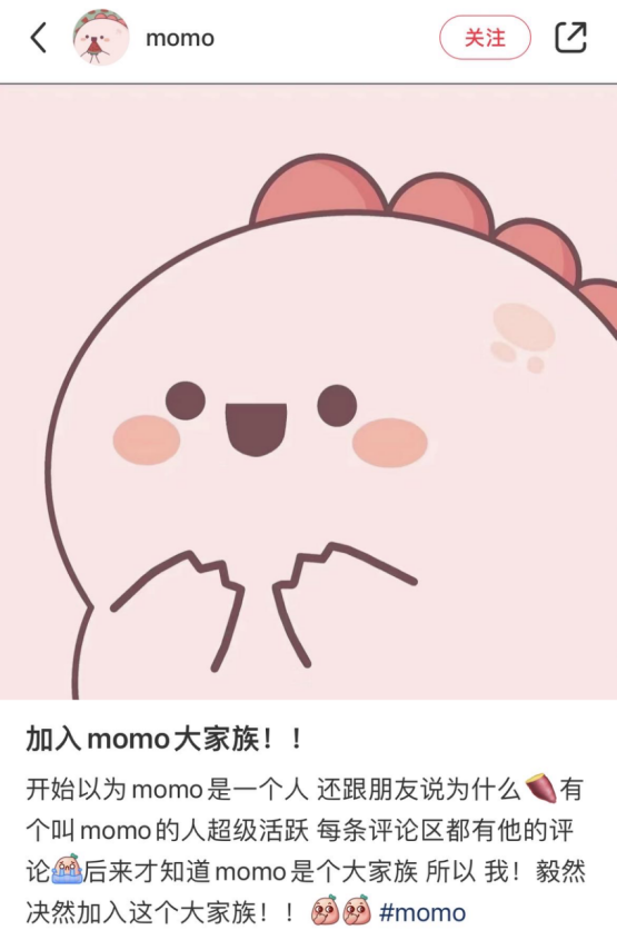 “momo”最開始流行於豆瓣小組,這是豆瓣為用户提供的默認名字。在互聯網環境越來越嚴苛的當下,為了“反扒皮”,豆瓣網友開始集體更名為“momo”,統一換上粉色小恐龍頭像,以求“保護自己”。