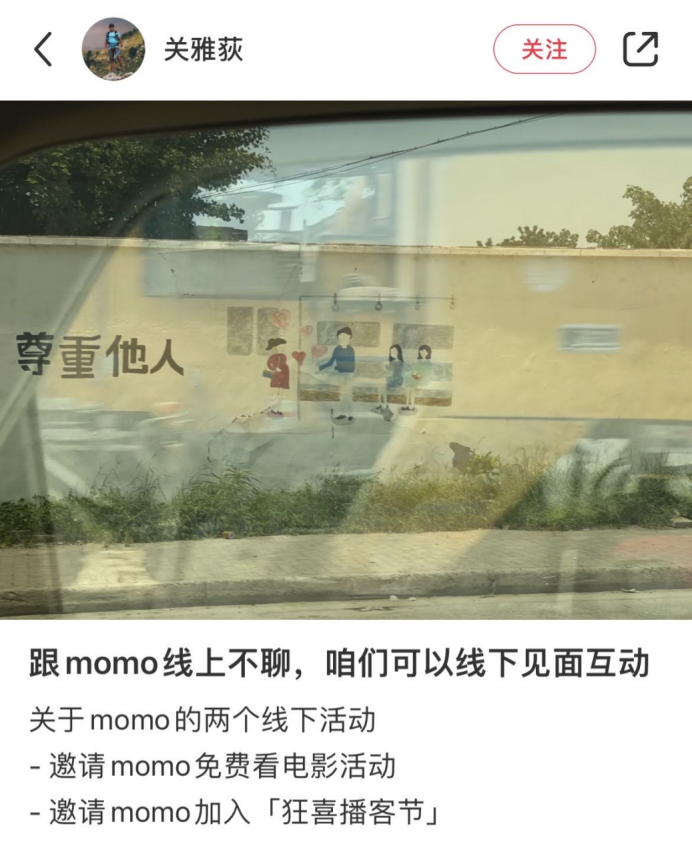以關雅荻為例,很顯然,關雅荻意識到了此次互動的正面價值以及小紅書娛樂營銷的潛藏商機,“大戰momo”應該是關雅荻入駐小紅書以來曝光量最高的一次用户互動,強大的UGC屬性可以一方面為娛樂內容進行用户傳播,另一方面也在提高明星本人與平台的商業價值與空間,關雅荻也試圖通過線下觀影的方式對此次“大戰”進行轉化,只是最終只有2人到場,確實有些難度。