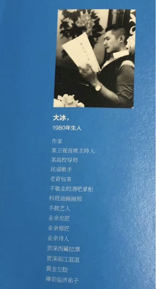 因為發現大冰擁有“主持人、作家、酒吧老闆、油畫家、皮匠、銀匠、歌手、手鼓藝人、揹包客、黃金左臉、法國騎士、禪宗弟子”的超長前綴,以及《乖,摸摸頭》《我不》《你壞》《阿彌陀佛麼麼噠》《好嗎好的》等一系列如今看起來有些“矯情”的著作,網友們紛紛對他開啓了嘲諷模式。