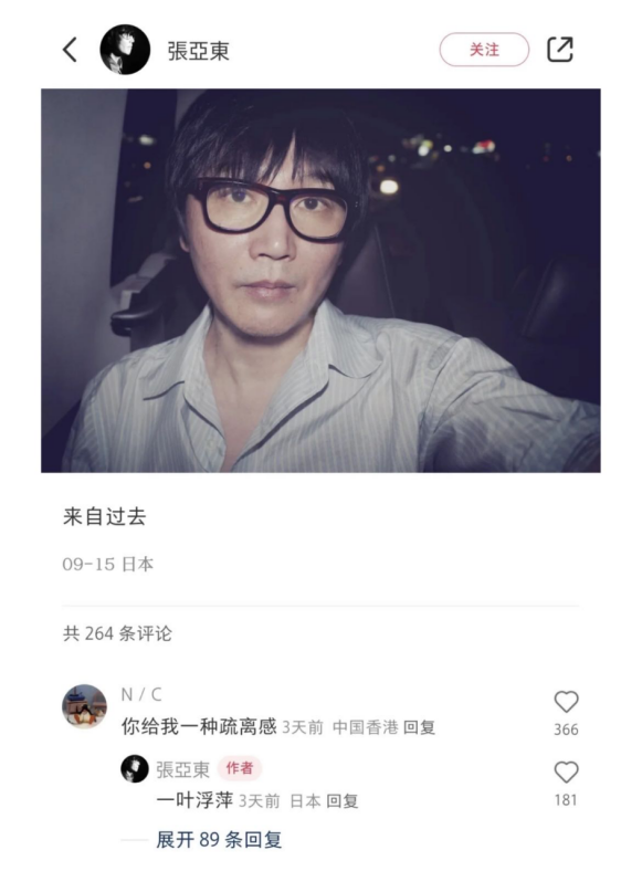 9月15日,張亞東發佈了一張自拍,並配文“來自過去”。前排評論是“你給我一種疏離感”,這是互聯網上流行的“釣文藝男語錄”,張亞東顯然並不知道這個梗,因為他很真誠地回覆網友,“一葉浮萍”。