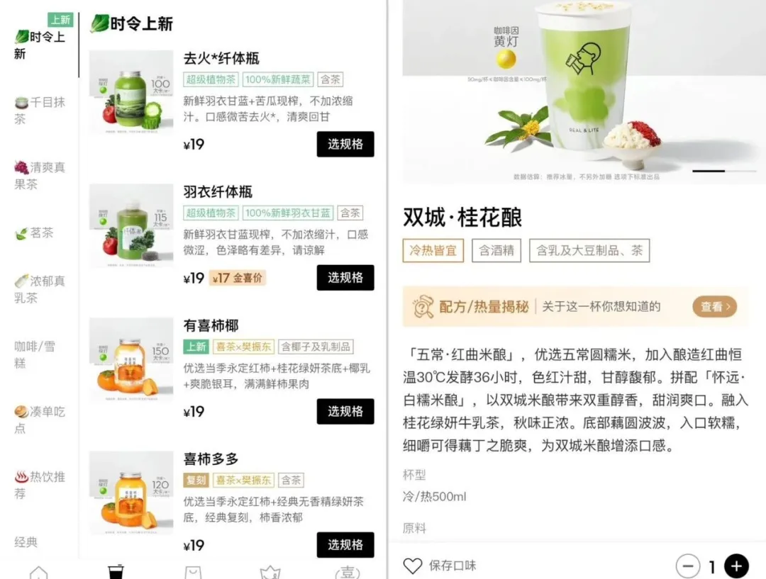 目前去其小程序點單,能看到排最前面的是“時令上新”,包含2款超級植物茶、2款喜柿系列、還有一款雙城·桂花釀,也是秋季應景的產品。