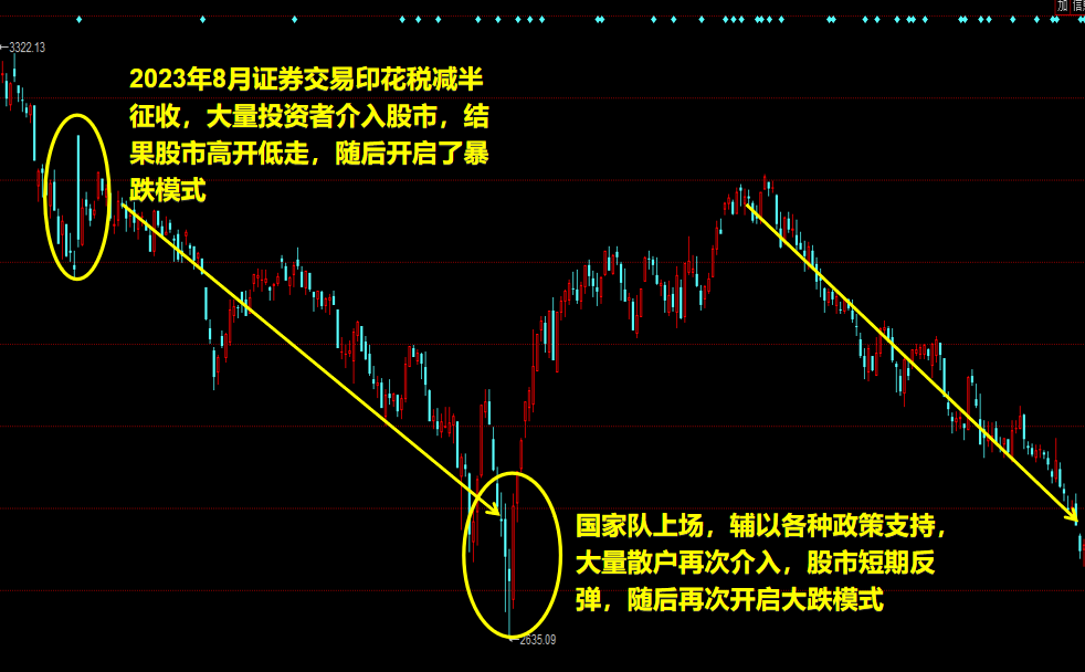 為了提振股市,2023年8月財政部,國家税務總局決定將證券交易印花税減半徵收,大量投資者介入股市,結果股市高開低走,隨後開啓了暴跌模式,股民損失慘重;