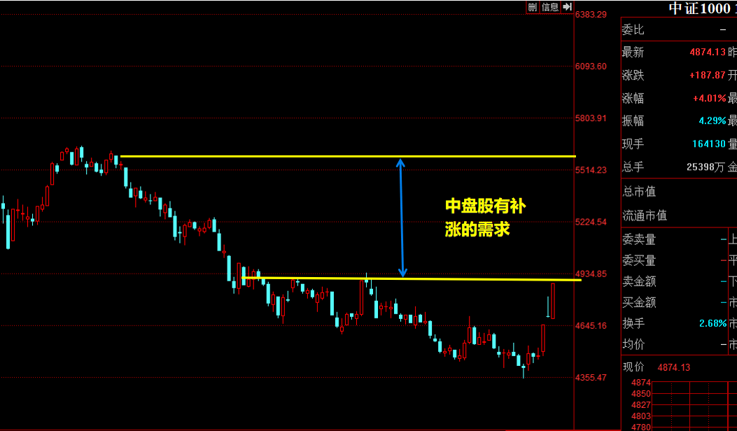 雖然大盤股已經收復前期的“失地”,但是以中證1000、中證2000為主的中小盤還在“坑裏”呢,有補漲的需求——大盤股出現了大幅度上漲,很多人不敢買入了,但中小盤股票漲幅比較小,很多人就會買入中小盤。