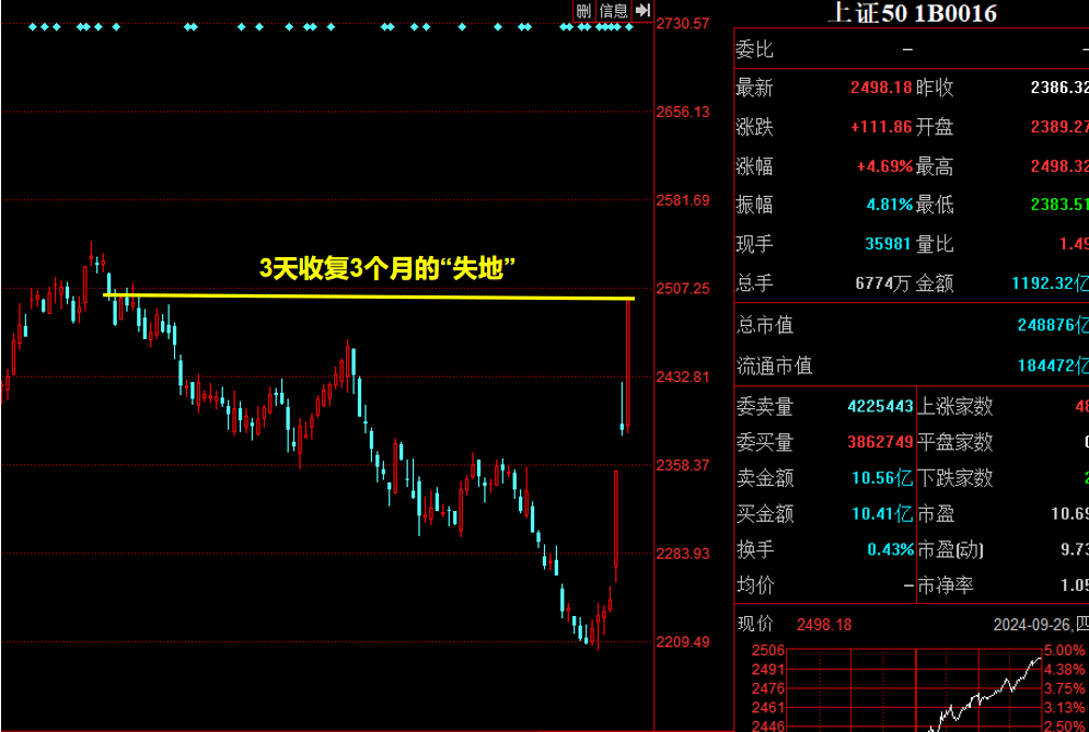 9月24日,上證50指數暴漲4.86%;9月25日,上證50指數漲1.45%;9月26日,上證50指數再次暴漲4.69%。三天時間收復了3個月的“失地”。