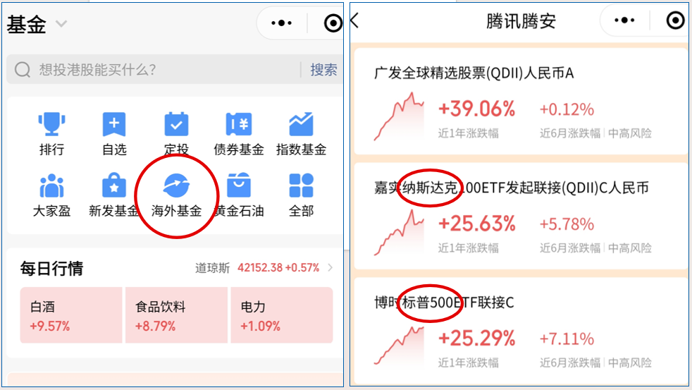 在去年的時候,我就發現微信的“理財通”裏面有“海外基金”這個投資項目了。點開後就會發現很多基金公司都有購買美國、日本、德國等國家股票的通道——基金公司幫你去購買海外基金。