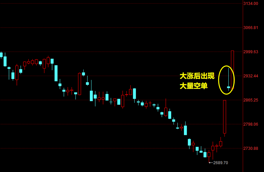 9月24日,在降準、降息和專項再貸款鼓勵股票回購增持等政策的支持下,股市出現暴漲。但,隨後便出現大量空單……9月25日,在大量空頭的打壓下,上證指數走了一個長長的倒錘頭陰線……按照正常理解,接下來的形勢就會非常不妙……但是,9月26日,上證指數再次暴漲,吊打了空頭。