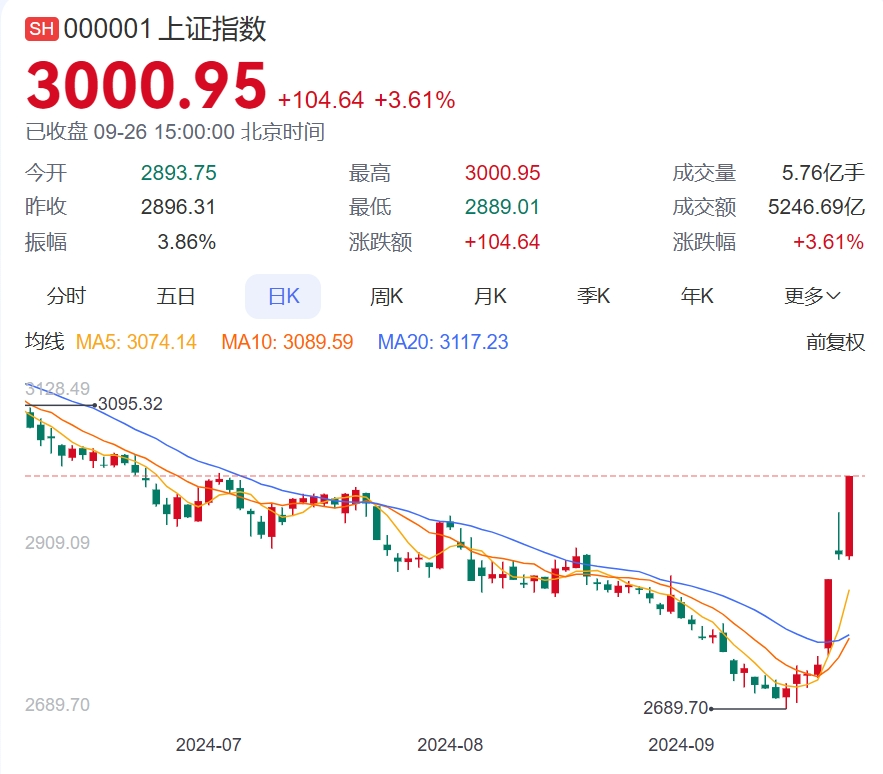 2024年9月26日,上證指數重返3000點大關,市場終於躁動起來了。