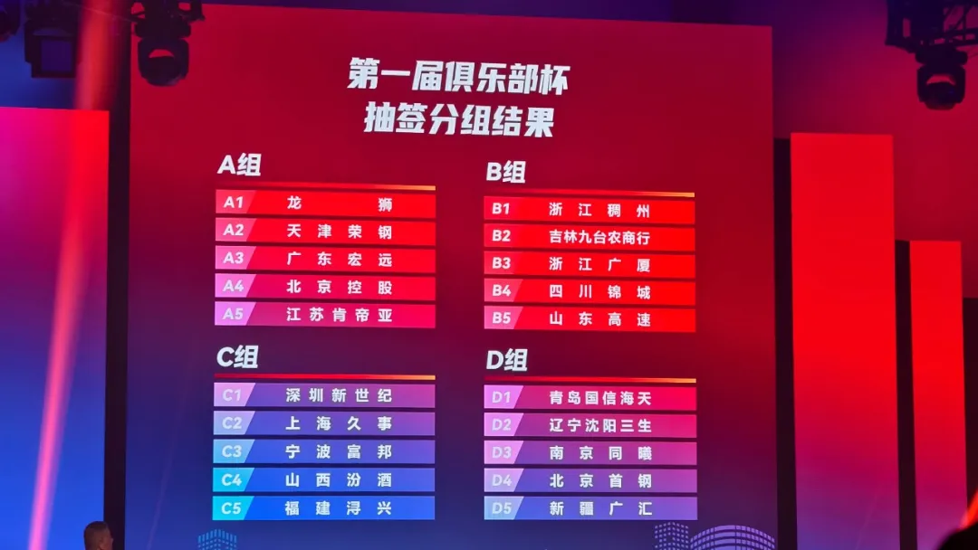 在發佈會現場,首屆CBA俱樂部盃賽進行了抽籤分組儀式。其中廣州、天津、廣東、北控、江蘇處於A組;浙江、吉林、廣廈、山東、四川位於B組;深圳、上海、寧波、山西、福建位於C組;青島、遼寧、同曦、北京、新疆則落入D組。