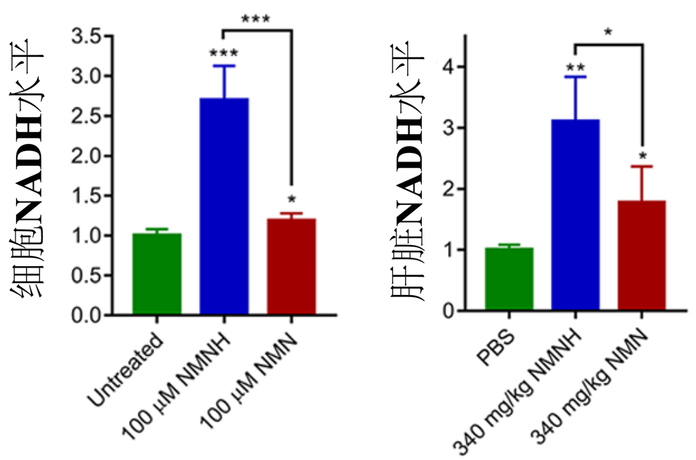 作為NAD+的“帶電子版本”,NADH在調節線粒體功能[4]、抗氧化[5]、抗細胞凋亡[6]方面也有着重要的作用,同樣的,NMNH也可以**大幅提升細胞體內的NADH水平,**約為NMN的2倍!