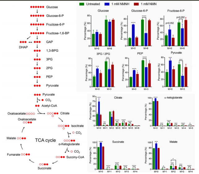 不過,NMNH還有隱藏屬性:經過NMNH處理後的細胞,內部的糖酵解和TCA循環活動普遍受到了抑制[3]。而NMN處理的細胞,則只是輕微減少了糖酵解的某些產物,TCA循環的降幅幾乎可以不計。