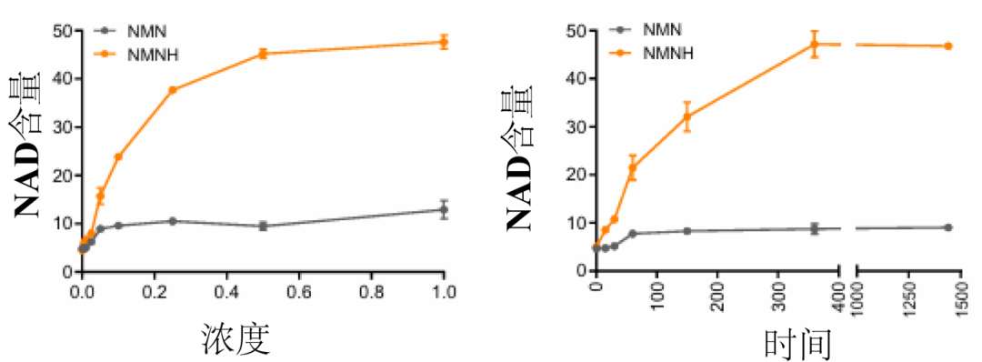圖注:相比NMN,NMNH提升NAD+速度更快