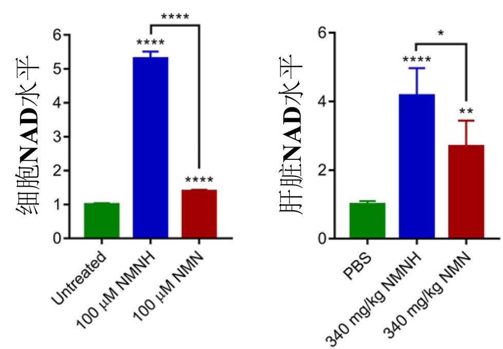 在增強NAD+水平方面,NMNH表現出比NMN更強大的功效[3]。NMNH處理12小時後,細胞內NAD+濃度顯著提高了5倍,而同等劑量的NMN僅能輕微提升NAD+水平。