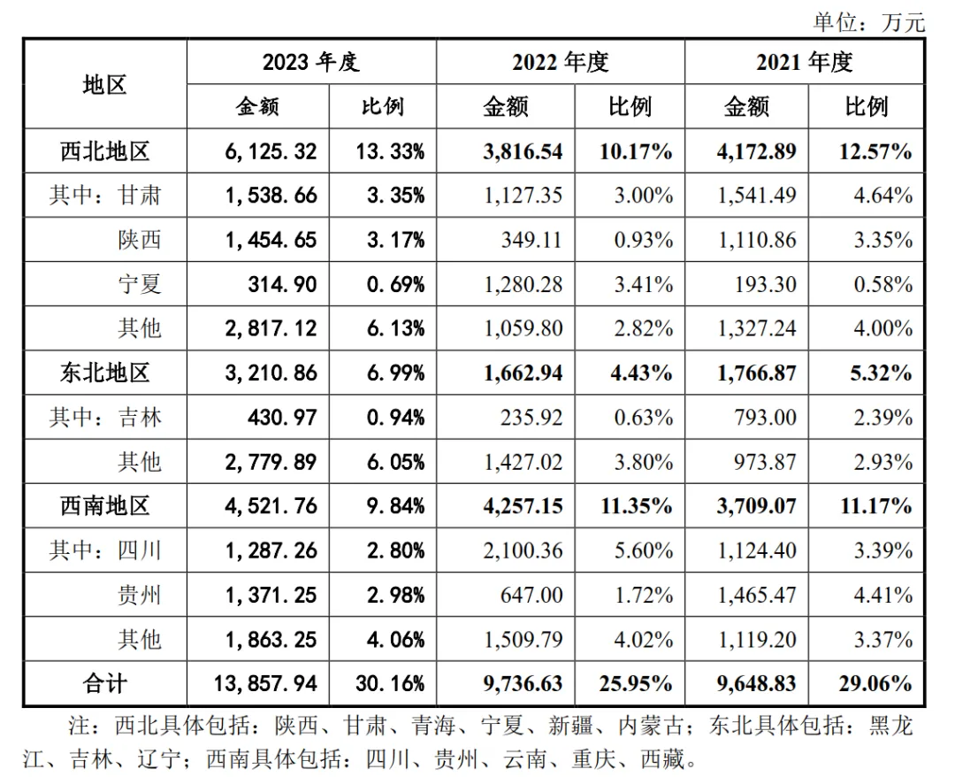 託普雲農表示,公司銷售區域分佈較廣,除公司所在的華東地區外,在西北、東北、西南地區的收入佔比相對較高。