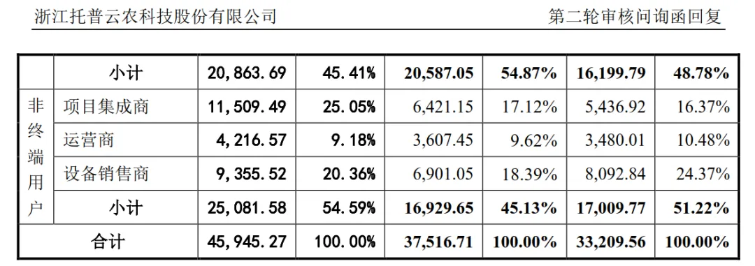 託普雲農表示,報告期各期,公司向非終端用户的銷售佔比分別為51.22%、45.13%和54.59%。