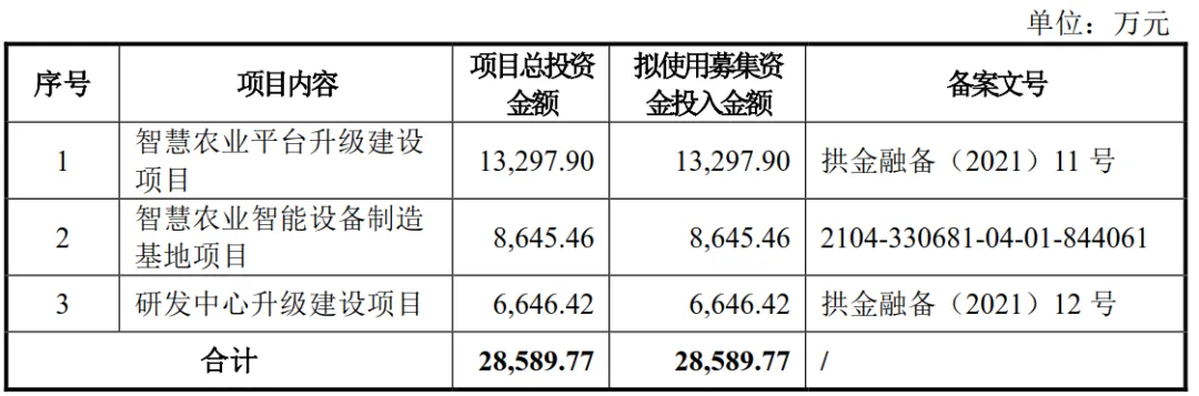公司此次公開發行股票並在創業板上市,擬募集28,589.77萬元,分別用於“智慧農業平台升級建設項目”13,297.90萬元;用於“智慧農業智能設備製造基地項目”8,645.46萬元;“研發中心升級建設項目”6,646.42萬元。