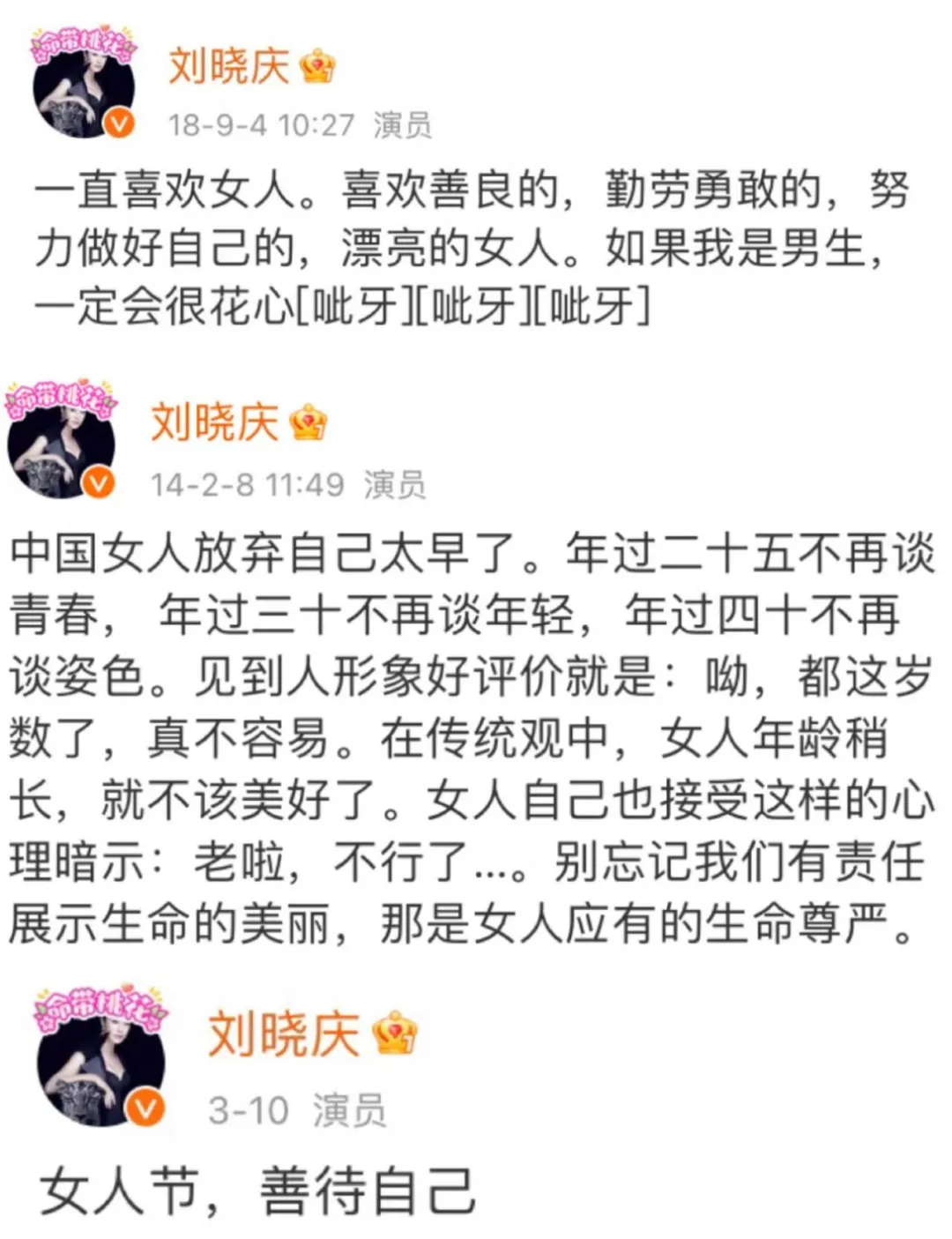 **針對年齡焦慮,劉曉慶説“中國女人放棄自己太早了”。**面對愛情,劉曉慶説“為了愛情這件小事,居然要犧牲自己寶貴的生命,真是太不值得”。談及生育,劉曉慶説“絕不認為生孩子是你生命的延續”。只要是你能想得到的話題,翻翻劉曉慶的微博和採訪,就會發現人家早已現身説法。
