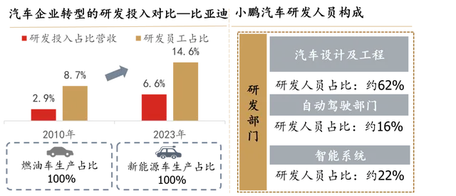 以比亞迪汽車為例,在其未生產新能源汽車期間研發投入僅佔總營收不到3%;而2023年在比亞迪宣佈全面生產新能源汽車後,企業研發投入佔比上升至6.6%,可見技術研發對新能源汽車企業的重要性。