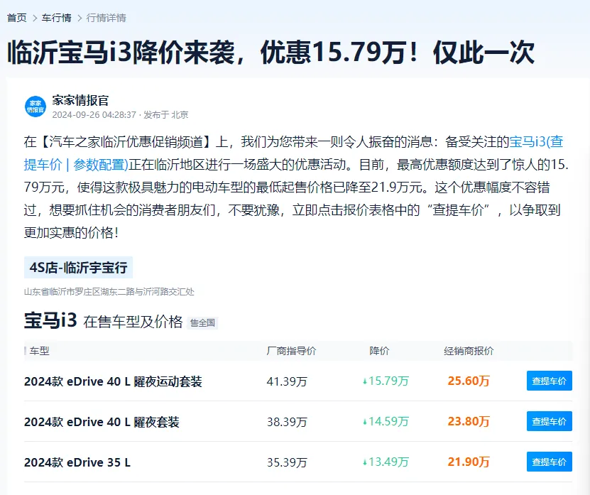 最近,在宣佈漲價三個月後又被曝出重回“價格戰”的寶馬,其電動車終端優惠力度空前,包括iX1、i3、iX3、i7等,降幅在10萬元至30萬元不等。以寶馬i3為例,其終端優惠幅度已經超過了15萬元,這意味着它在部分市場的實際裸車價已經來到了真正的20萬級,放在國內自主純電動車市場,相當於一台吉利生產的極氪007。