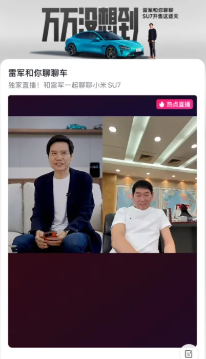 而在這一波“直播帶貨”風潮中,反應最快的當數蔚來CEO李斌,他於3月14日首次在社交平台直播,當天直播累計觀看人數超1000萬人;作為流量扛把子,小米汽車緊隨其後,在4月18日下午,雷軍在其個人抖音賬號上開啓了主題為“萬萬沒想到——雷軍和你聊聊SU7開售這些天”的直播,一場直播漲粉超過83萬,直播期間更是穩居熱榜排名TOP 1;8月13日,小鵬汽車董事長兼CEO何小鵬開啓小鵬G6光電(用光電池電量)測試直播,測試這款純電SUV的續航,據悉,這是何小鵬本人賬號舉行的首場直播。