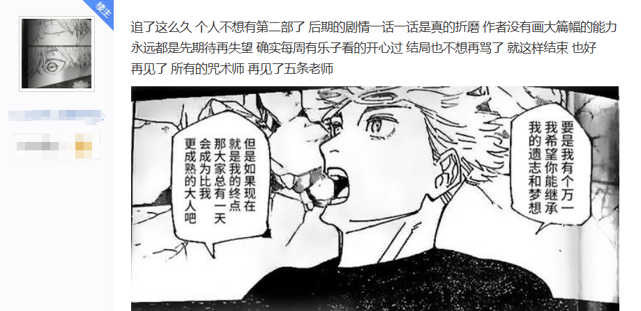 但對於漫畫讀者來説,作品的商業前景和行業意義往往不在考慮範圍內,純粹出於心中熱愛和對角色的感情而投入真情實感。面對《咒術回戰》漫畫後續質量一路下滑,讀者們大多認為是創作者芥見下下對作品不負責的表現,正如粉絲們看到五條悟被腰斬退場後所説的:“芥見下下在這麼多的退場方式裏,選擇了最不體面的一種”,那些始終堅持購入單行本的粉絲只能自嘲“被騙感情還要被騙錢”。