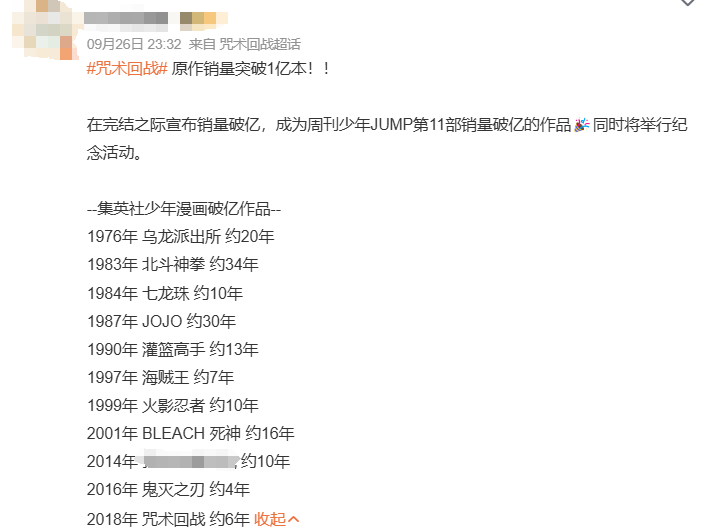 與《咒術回戰》漫畫完結一同公佈的還有系列漫畫銷量破億的消息,待到第28卷後續發售,踏入《週刊少年JUMP》歷史漫畫銷量前十隻是時間問題。近些年裏基於漫畫改編的系列動畫、劇場版動畫、手遊以及大量衍生周邊也都達成亮眼的成績。