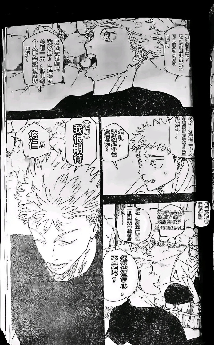 距離大結局的發售日還有3天,但根據“內鬼”放出的圖透,首先是各位最最最最關心的,五條悟沒復活,但他與虎杖的對話多少有點“人雖死魂猶在”的意思。被虎杖等人擊敗的最終BOSS宿儺也選擇放棄輪迴,想必不會再有“鬥儺大陸2.0”。最後一根宿儺的手指重新被封存起來,與故事開頭的畫面形成呼應,也為這部連載6年的漫畫畫上了句號。