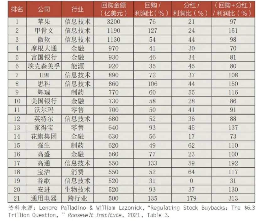 蘋果公司是世界上股票回購支出最高的公司,在這十年間用於回購花了3200億美元,將幾乎所有(97%)的淨利潤通過分紅和回購分配給了股東;高通公司向股東分配的資金達到淨利潤的192%,這意味着高通必須通過借債或者出售資產來維持對股東的資金分配。而舊經濟代表的通用電器,在十年間將313%的淨利潤分配給了股東,並在2018年創造了220億美元的虧損。
