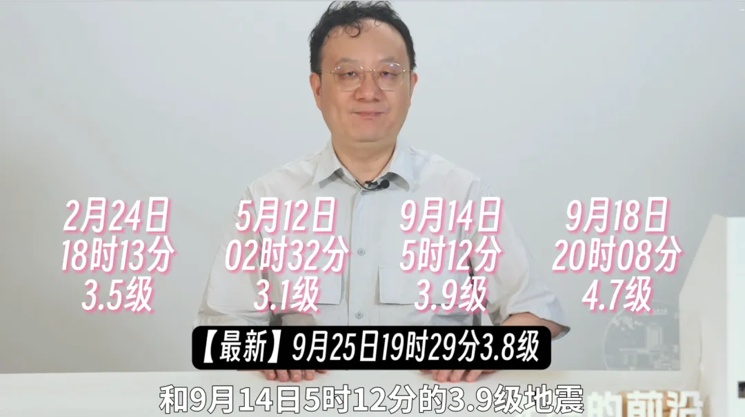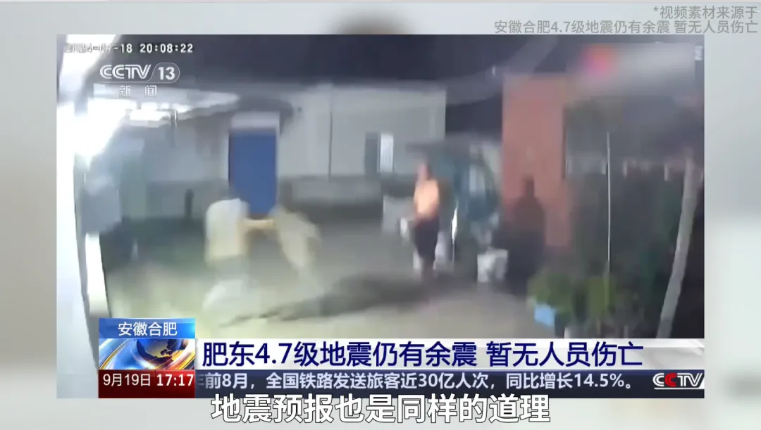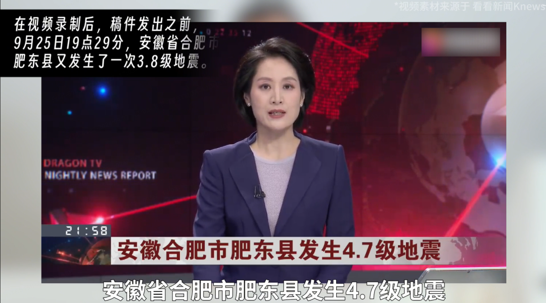 視頻錄製後,稿件發出前,據中國地震台網正式測定:9月25日19時29分在安徽省合肥市肥東縣(北緯32.00度,東經117.61度)發生3.8級的地震,震源深度12千米。