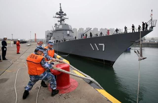 ▲訪問中國青島的涼月號,我軍水兵正在幫其靠岸