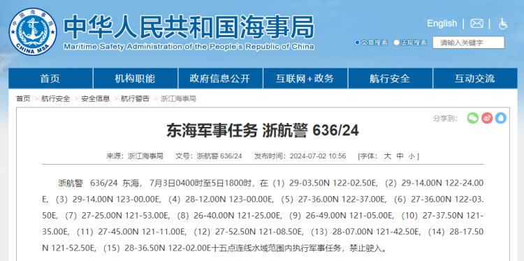 今年7月2號,浙江海事局發佈航行警告,宣佈自3號凌晨4時至5號傍晚6時的62小時內,特定水域範圍將執行軍事任務,禁止船隻駛入。