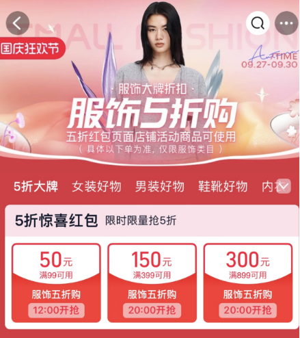 但有意思的是,**今年9月,淘寶和京東都拿出了直接的 5 折促銷玩法。**京東先起的頭,9 月 19-25 日,京東服飾全場 5 折。淘寶馬上在 20 日跟上動作回擊,天貓服飾上線秋冬服飾新品會場,也是全場 5 折。
