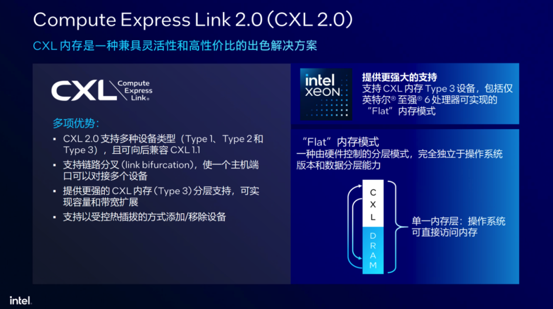 更值得一提的是至強®6獨佔的“Flat”內存模式,CXL內存和DRAM內存被視為單一的內存層,讓操作系統可以直接訪問這一統一的內存地址空間。