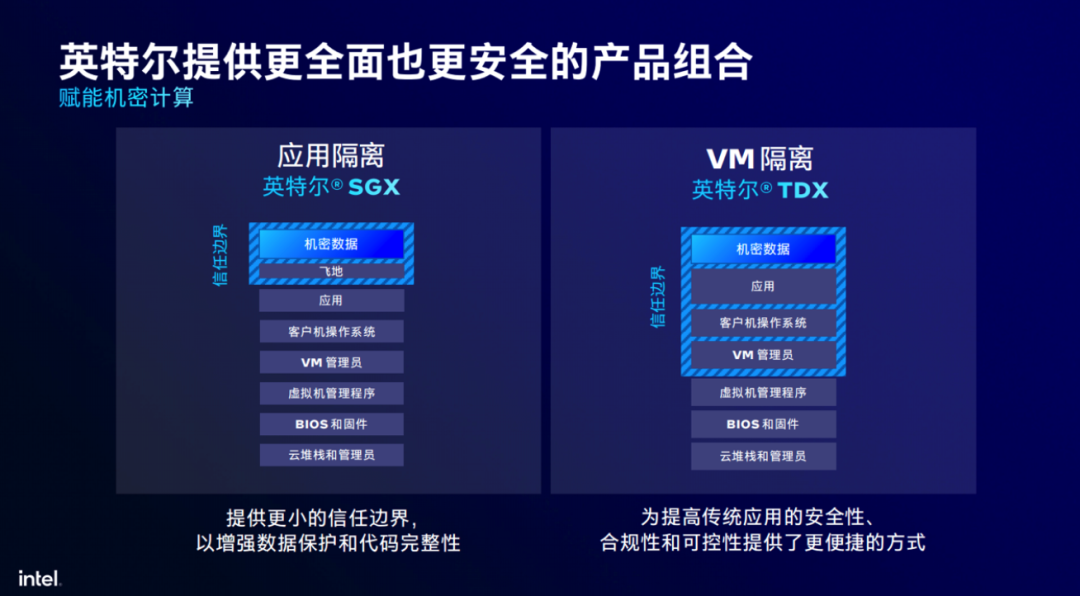最後在硬件增強的安全特性方面,英特爾早期的方案為SGX,但從第五代至強®開始新增了TDX方案。這些看似難以通過Benchmark數值來證明自身價值的技術,實則不可或缺,是確保關鍵數據和應用更為安全可靠的壓艙石。