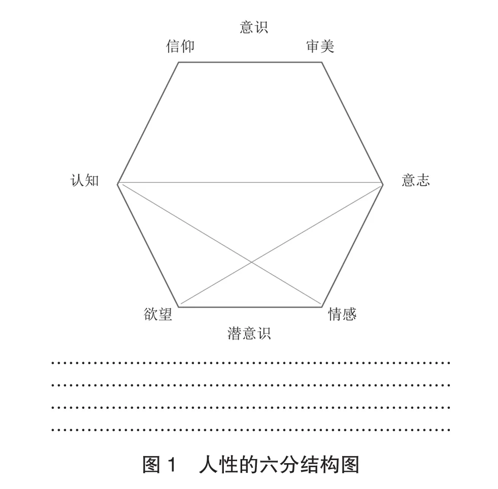 繼承和綜合此前思想家的資源,下面我嘗試提出一個人性的形式分析結構。它不涉實質性的道德觀念和立場,只是指出人性的六個要素,大概地劃定一些範圍或領域。大量富有成效的研究肯定需要切入其中的某一點才能深入。研究者如果有這樣一個形式框圖,至少可以獲得一種位置感,亦即自己的研究處於什麼位置,可以和其他的人性研究建立什麼聯繫?