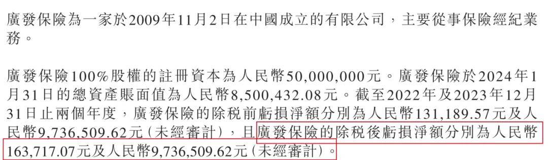 廣發保險是一家保險經紀公司,並且還處於虧損之中。數據顯示,2022年、2023年,廣發保險除税後虧損淨額分別為16.37萬元、973.65萬元(未經審計)。