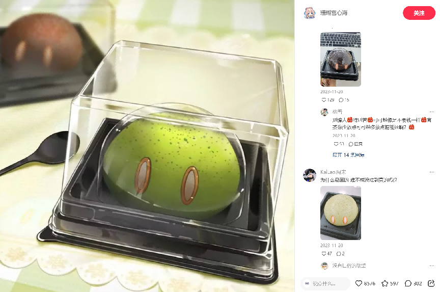 另一次是去年,我有段時間沉迷户外旅遊,動身前一般會用小紅書搜一搜景點和美食。結果不知道是不是被算法逮捕了ACG標籤,推上來一張精美的史萊姆糰子糕點照片,好奇之下一看發佈者屬實沒蚌住:↓