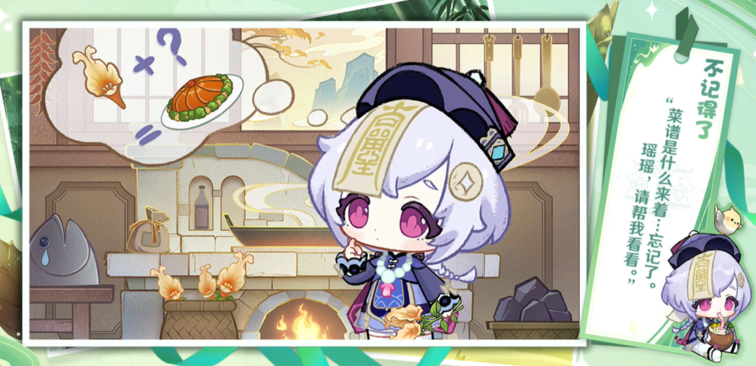到了去年推出的聯動《攜友山間行》中,七七與瑤瑤作為主要劇情角色參與其中,順應原有設定,趣聞裏就呈現了下廚記不住菜譜求助場外觀眾的逆天操作。