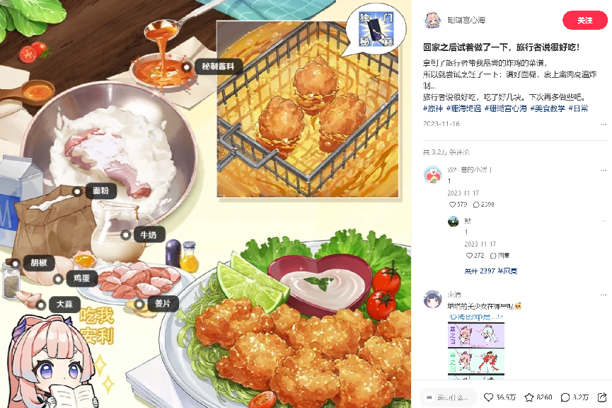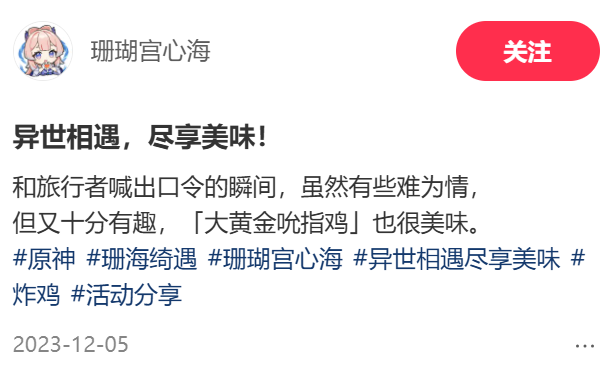 為了“拉進角色與玩家的距離”的同時營造出“故事性”,業務團隊最終將背景設定為海祇島領袖對外考察,期間讓珊瑚宮心海入駐小紅書成為博主,以打卡,種草互動的方式分享自己工作之餘的點點滴滴。