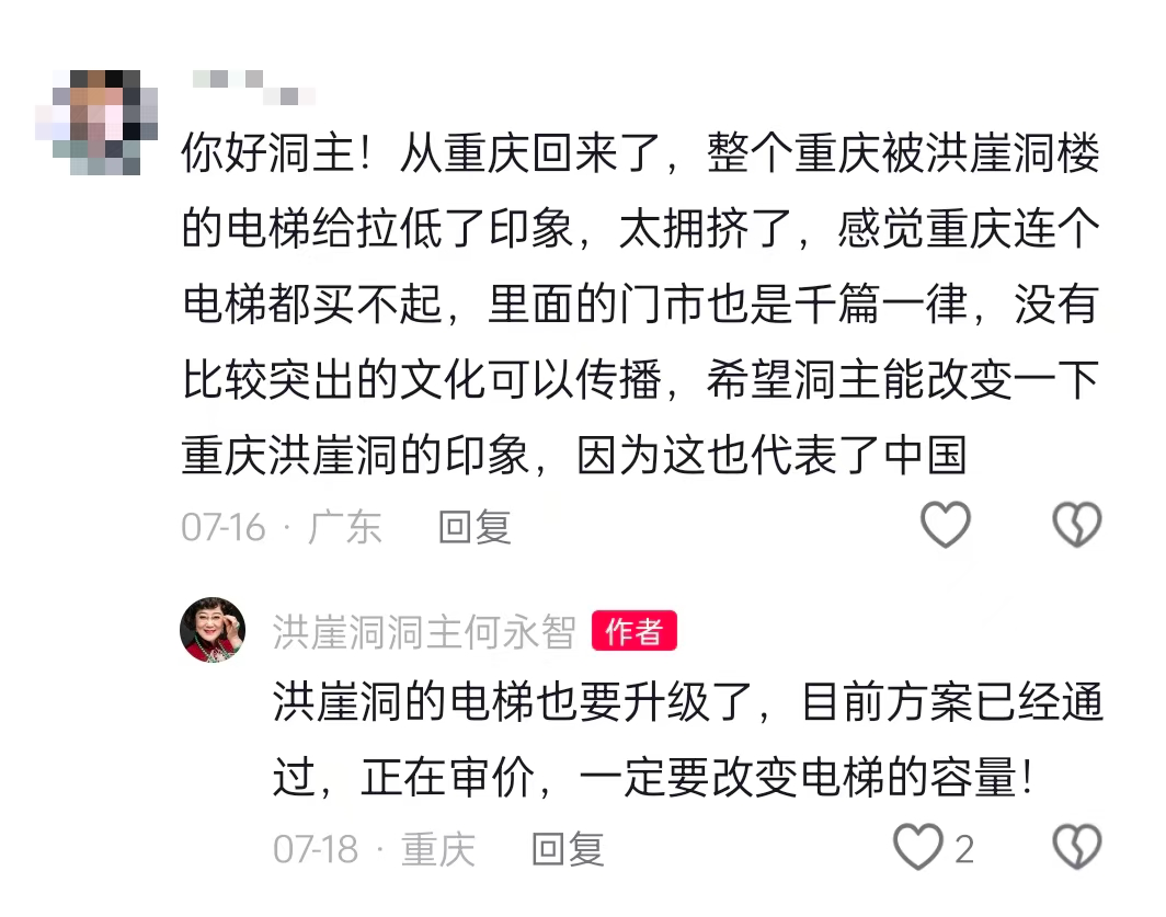 在網上,她也和雷軍一樣,會把網友當家人毫無架子,有人喊話何嬢嬢,趕緊在洪崖洞建新電梯、衞生間,還有人向她請教開店問題,都會耐心給出回覆。