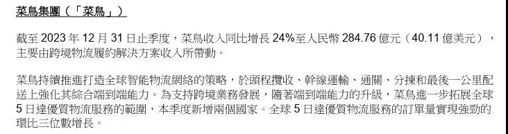 據菜鳥2023財年報表數據,其總營收錄得778億元,其中國際物流、國內物流分別以368.5億元、359.6億元營收佔據第一大業務、第二大業務的位置。而據機構按2022年包裹量計算,菜鳥日均跨境包裹量已超500萬件,已經是全球第一的跨境電商物流企業,並擁有就地理覆蓋範圍而言全球最大的物流網絡。