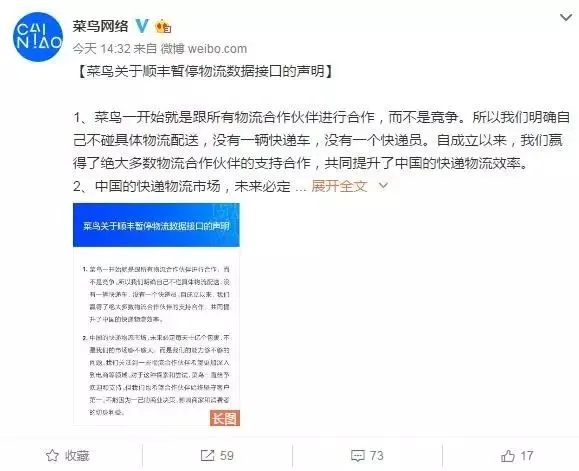 隨後,順豐官方微博立馬迎戰菜鳥,稱菜鳥基於自身商業利益出發,在2017年5月要求豐巢提供與其無關的客户隱私數據,而豐巢本着對顧客的底線,拒絕這一要求,而接口的斷連,實際上也是由菜鳥單方面操作。