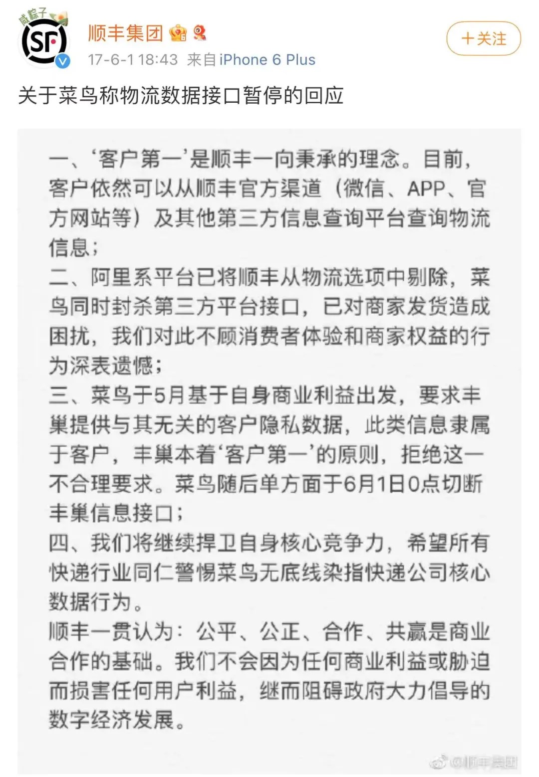 2017年6月,菜鳥網絡官方微博發表聲明稱,順豐暫停其物流數據接口。而暫停接口的後果要由顧客承擔,因為存放在豐巢的快遞,不能從菜鳥服務中查看。