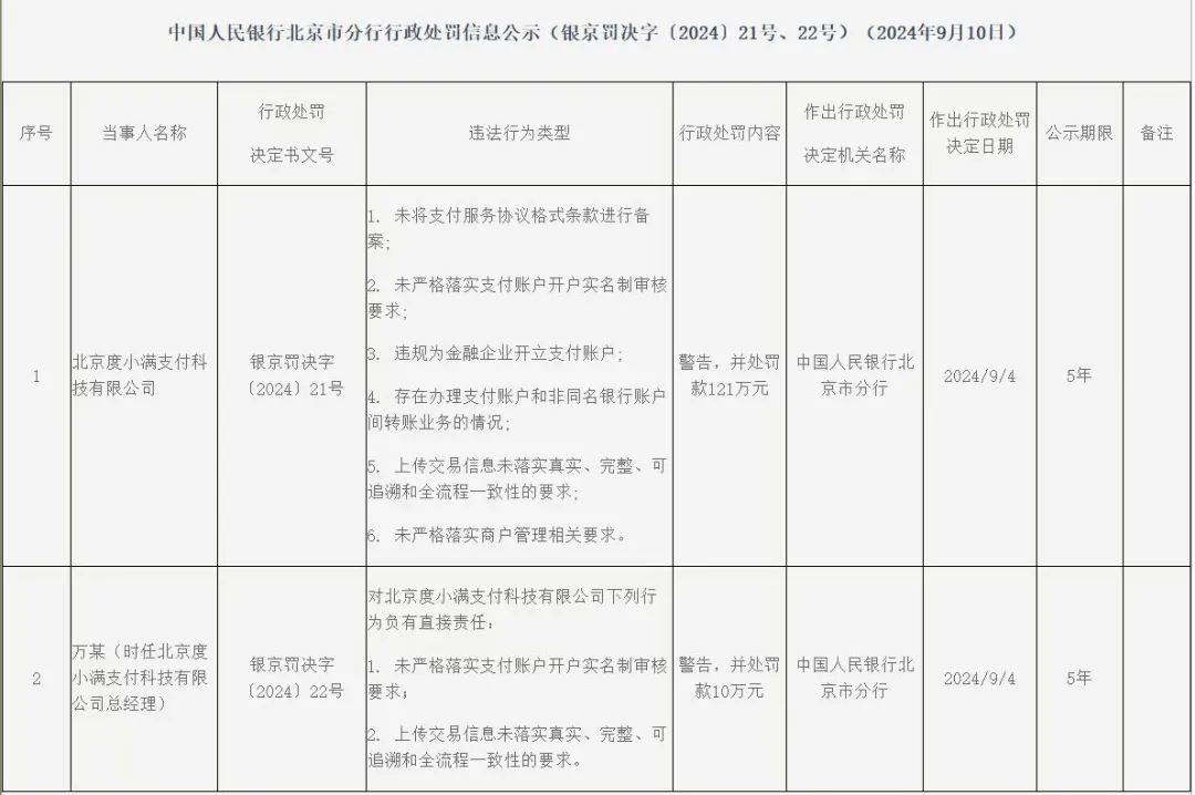 度小滿支付業務被重罰,且該處罰信息將被公示長達五年。9月10日,央行北京市分行發佈行政處罰,公示表顯示,北京度小滿支付科技有限公司因六項違法違規行為,被警告並罰款121萬元。除此之外,當時擔任度小滿支付總經理的萬某也被警告並罰款10萬元。