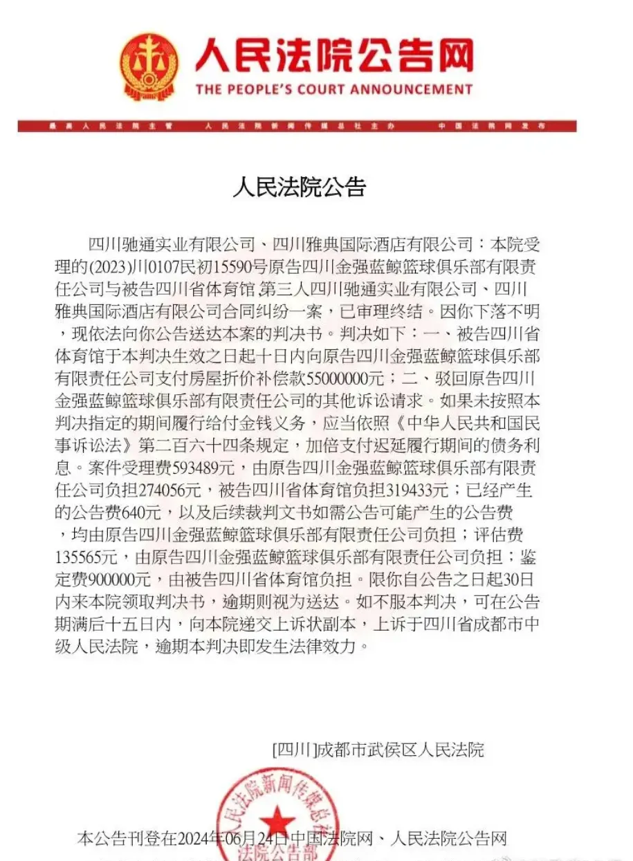 今年6月24日,四川金強男籃也迎來一則利好。四川省體育館被法院一審判決賠償金強俱樂部拆遷款5500萬元。2020年四川省體育館為了迎接大運會,進行大規模改造,拆除了金強俱樂部大量房屋及商鋪,造成了俱樂部極大的經濟損失。四川省體育館是省屬事業單位,要能拿出這筆錢,想必也不會鬧到法院。要知道,周仕強同時也是四川省籃協主席。