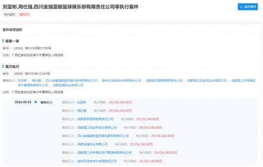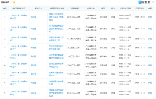按照公開信息顯示,周仕強包括四川金強俱樂部在內的9家公司均遭遇司法凍結,被執行金額超2.36億元,2024年9月3日又新增了廣西南寧清秀區法院的執行信息,執行金額2955萬元。