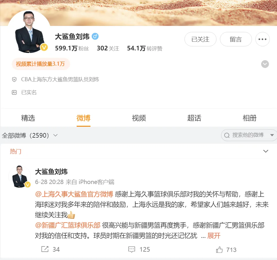 不過劉煒現在的微博認證還是大鯊魚劉煒……
